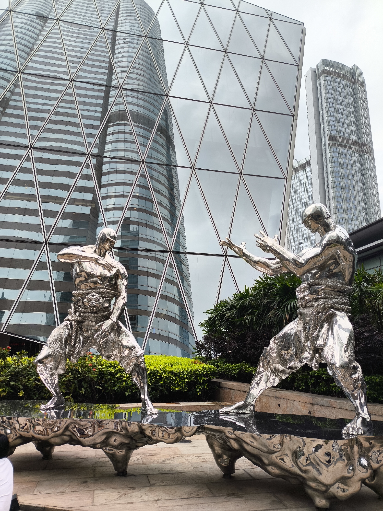 Two highly polished chrome metallic sculptures of male figures in dynamic martial arts poses are positioned outdoors in Central, Hong Kong, China