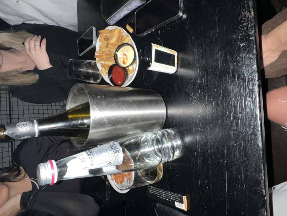 The scene depicts a dark-toned interior, identified as an indoor establishment, possibly a bar or restaurant, with a black, worn wooden table serving as the central surface. Partial views of at least four individuals are present. On the top left, a female with dark hair, wearing a black long-sleeved top and a silver necklace, is visible from the chin down. To her right, a blonde-haired female, also in a black long-sleeved top, is visible from the chest up, with a ring on her left ring finger. Below the table, the knees and lower thighs of two other individuals are partially visible. Arranged on the table are several items: a tall, clear glass bottle of sparkling water with a silver and red cap, labeled with Hebrew text, stands partially full. Adjacent to it, a silver ice bucket holds a green-glass bottle of white wine, topped with a silver foil label bearing a "B" logo. A clear drinking glass containing a small amount of amber liquid is positioned near the water bottle. A white, oval-shaped plate piled with french fries is presented with two small ramekins, one containing red ketchup and the other a pale yellow sauce. Two black smartphones are present; one is face down to the right of the plate, and another is partially visible on the far right. A small, white and black rectangular object, possibly a portable charger or vape, stands upright on the table. A dark-colored wallet or clutch is also visible to the right of the plate. The background is dark and indistinct, featuring a metallic grid structure. The overall lighting is dim.