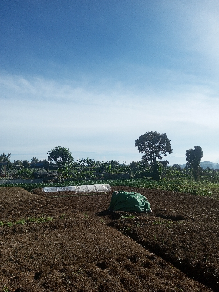 The image displays an outdoor agricultural scene in Phonethan, Laos. The foreground consists primarily of dark brown, freshly tilled earth, showing distinct raised rows and furrows, with sparse green sprouts visible. In the midground, an elongated, low structure covered with translucent white plastic sheeting, resembling a cold frame or small tunnel greenhouse, is positioned horizontally on the soil. To its right, a large, crumpled dark green tarp or bag rests on the tilled ground. Beyond the cultivated area, a dense band of various trees and green foliage forms a natural boundary, with some taller trees and banana plants identifiable. Distant, hazy mountains are visible along the horizon under a clear blue sky with minimal white cloud cover. No individuals are present in the scene.