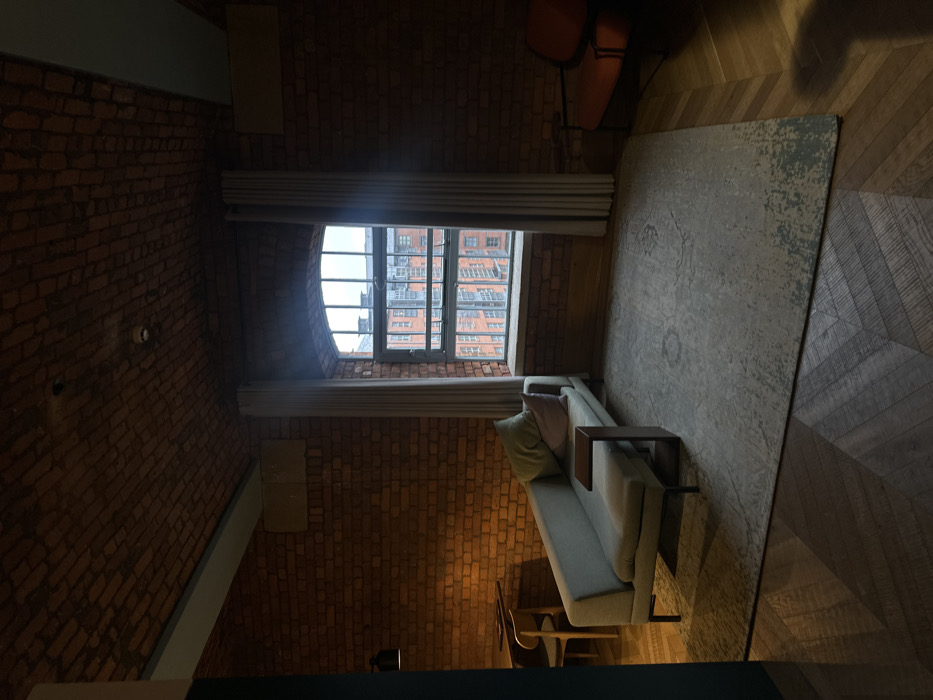 An interior view depicts a room within a converted industrial building in Manchester, United Kingdom, characterized by exposed red brick walls and a barrel-vaulted brick ceiling