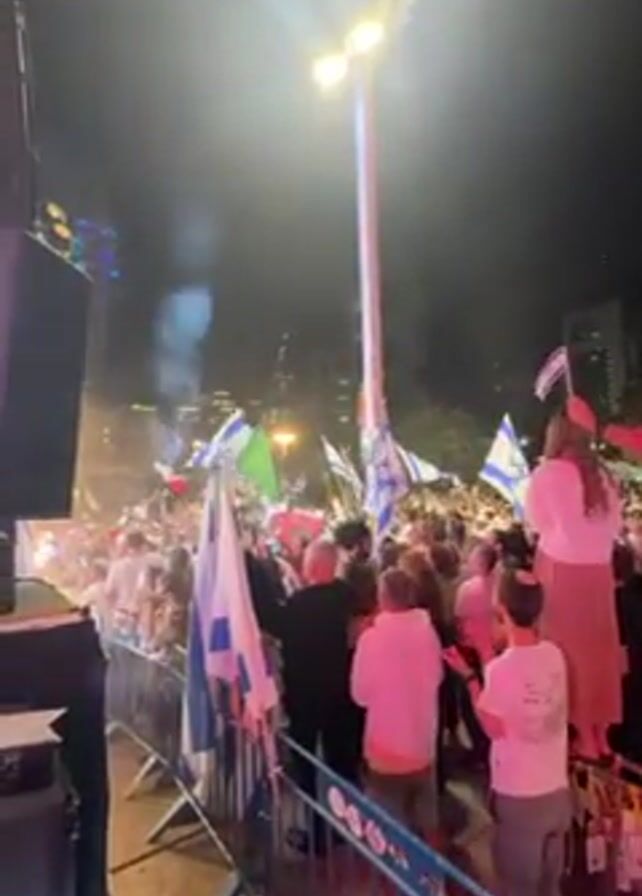 large crowd of people gathered at night, waving flags of Israel. There's a streetlamp illuminating the crowd. To the left of the crowd is a large speaker and a metal barrier. A few people have climbed onto some objects and are standing above the crowd. Tall buildings are visible in the background. The atmosphere is festive and lively.