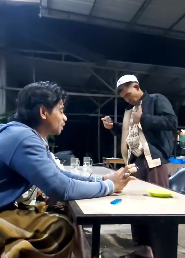 A low-angle shot captures two men at an outdoor café setting, under a metal-roofed structure. The man on the left, seated at a table, wears a blue long-sleeved shirt and a gold-toned sarong. He looks engaged with his mobile phone. On the table in front of him, there are clear glasses and a small blue object. The other man, wearing a white kufi cap, a patterned shirt, brown sarong, and a black jacket, stands opposite him, apparently adjusting his clothing. The background includes additional tables, chairs, and a food preparation or serving area with red and white elements. The setting suggests a casual evening atmosphere.