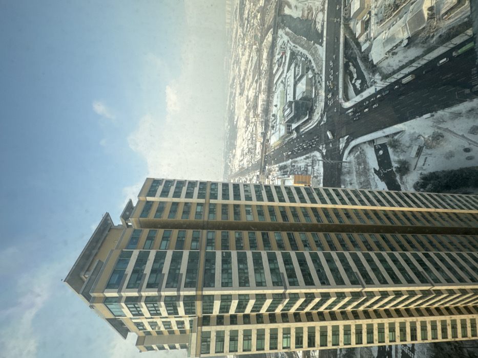 A high-angle shot shows a tall, modern building with many windows dominating the view. The building appears to be situated in an urban environment, as a snowy landscape with roads and other buildings stretches out in the background. The sky is visible with light blue with scattered clouds. The image appears to have been taken through a window, adding a slightly hazy quality.