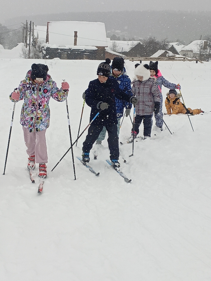 The image depicts six children engaged in cross-country skiing activities in a snow-covered open area within Sarapul, Russia, during active snowfall