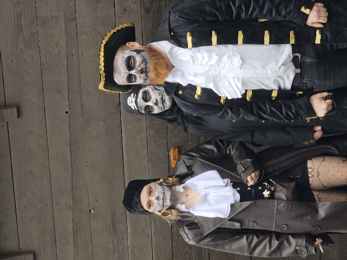 Three people dressed as pirates stand in a portrait. One man wears a black pirate hat with gold trim, a white ruffled shirt, and a black coat with gold accents. He has a red beard and skeleton face paint. Another person behind him wears a black pirate hat with a skull and crossbones and skeleton face paint. In front, a woman in a brown coat, black hat, and skeleton face paint wears fishnet stockings.