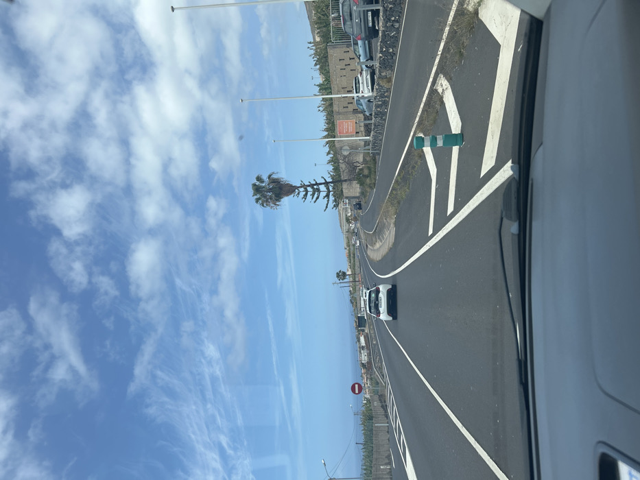view from inside a car driving on a highway in Adeje, Spain, at the coordinates 28.129, -16.76. The road is asphalt and has white lane markings. The sky is blue with white clouds. A single white car is visible ahead, and a green traffic post is in the center of the lane. Several other vehicles are parked on the right side of the road. The road is bordered on the right side by a low stone wall and a row of palm trees. To the left side, there is a row of green plants. The road curves slightly to the right in the distance. The image is shot from the driver's seat of the car, with the steering wheel and dashboard partially visible in the foreground.