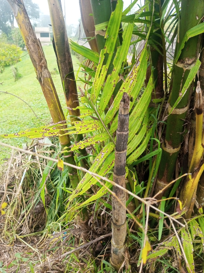 A close-up shot features bamboo stalks amidst dense foliage and weeds. The bamboo ranges in color from yellow-green to a striking dark brown. A palm leaf with numerous small holes and brown spots is prominently displayed. Overgrown vegetation fills the scene's lower portion, adding to the sense of untamed nature. In the distant background, a building is partially visible through the mist, adding a touch of human presence to the verdant landscape.