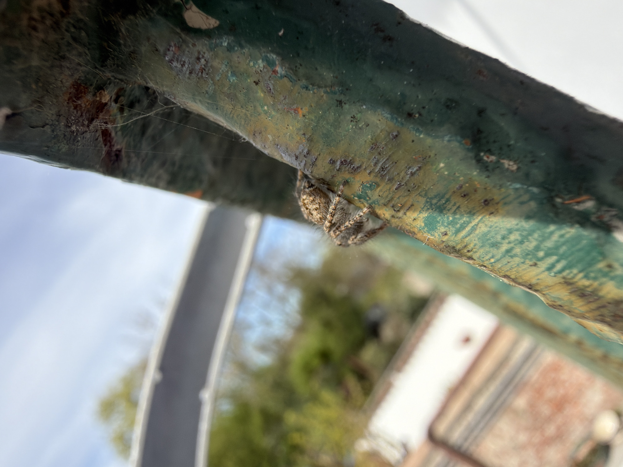A close-up shot depicts a spider clinging to a weathered, green metal bar