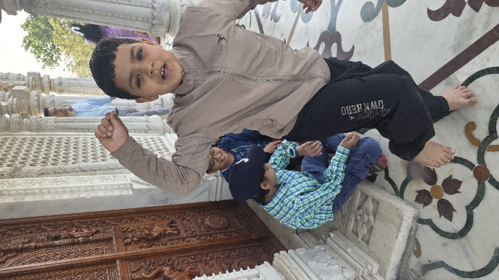 An outdoor scene captures five individuals within an ornate Indian temple or palace complex. The foreground features a young boy with dark hair, fair skin, wearing a light brown zip-up jacket and black track pants with "OWN HERO" printed on the left leg. He is barefoot, in mid-motion with his left arm raised and clenched fist, his mouth open, and looking directly at the camera. Behind him, to the left, another young boy in a blue baseball cap and green plaid shirt kneels on the patterned marble floor, facing right. Further back, partially obscured by the main boy, a third boy with glasses and a dark blue shirt is seated, smiling. The architectural background consists of intricately carved white marble pillars and walls featuring latticework (jali), leading to an exterior view with trees and partial figures of two adults: a man in a light blue shirt visible between pillars on the left, and a person in purple garment barely visible on the right. To the far left, a detailed wooden door with carvings of elephants and other figures is partially visible. The floor is an ornate marble inlay with dark green, brown, and ochre floral and geometric patterns.