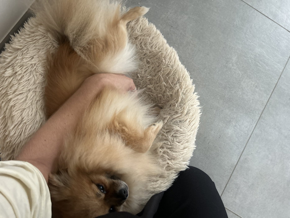 - "The image displays a small, light brown, fluffy dog, resembling a Pomeranian, resting within a circular, cream-colored, shaggy pet bed" by FM-bcuvC3, licensed under CC BY 4.0