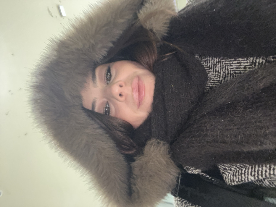 A female individual is depicted in a close-up, low-angle, head-and-shoulders portrait, consistent with a selfie, against an out-of-focus, light-colored interior background. She has dark brown hair and wears a winter coat featuring a prominent, light brown fur-lined hood, which is pulled up. A thick, dark brown, textured scarf is wrapped around her neck, covering the lower part of her face. The visible portion of her outer garment displays a black and white herringbone pattern. A black strap, indicative of a backpack or bag, is visible on her left shoulder. Her face shows visible eyeliner and light pink lips, with a neutral expression. The background reveals an indistinct, light-colored ceiling with faint markings and recessed light fixtures, indicating an indoor setting within the city of Lille, France.