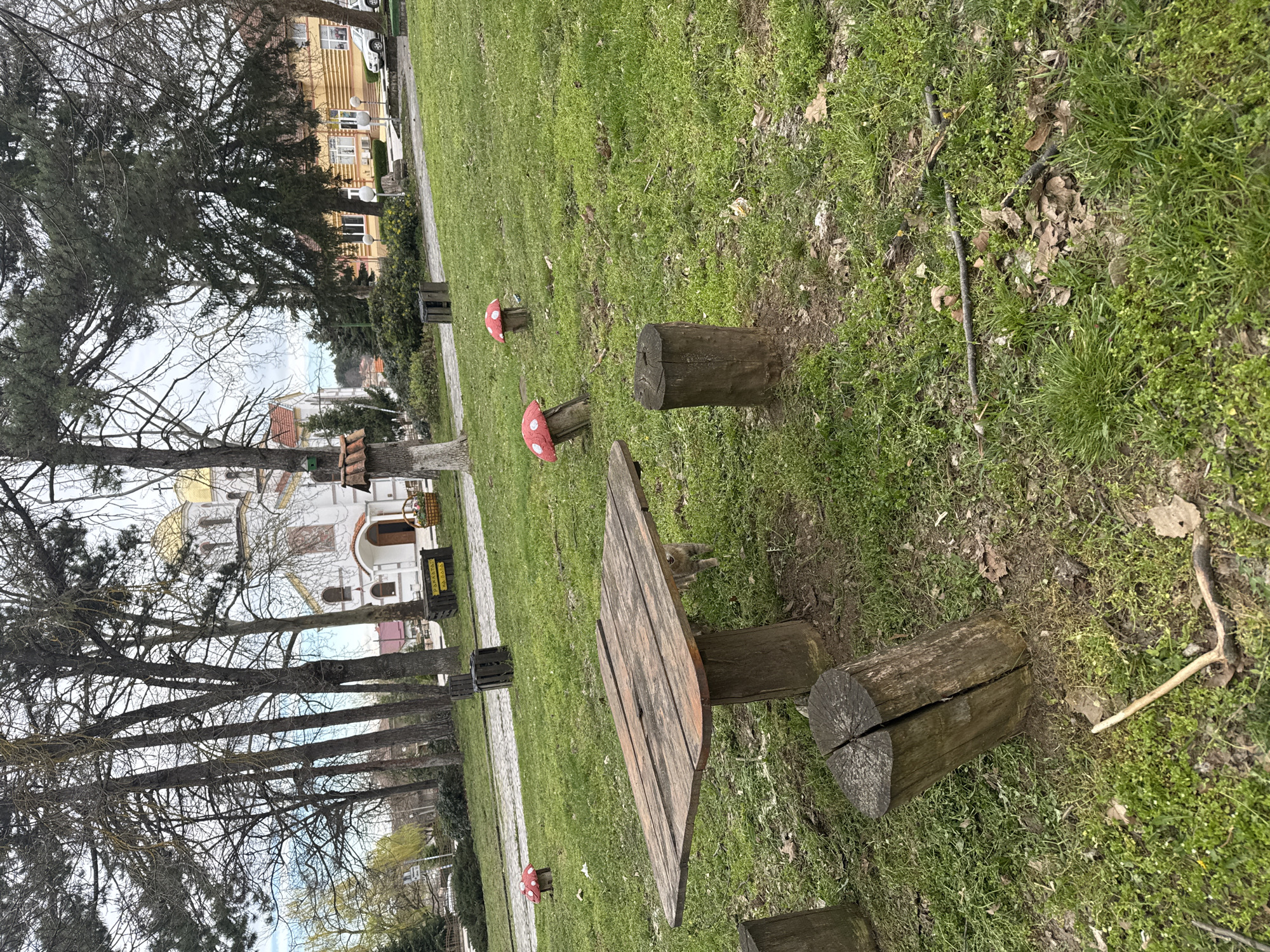 The image depicts an outdoor scene in Tervel, Bulgaria, featuring a rustic picnic table constructed from wooden logs. The table, with a diamond-shaped top, sits on a grassy lawn dotted with leaves and small branches. Several wooden logs serve as seats around the table, and three red-and-white mushroom decorations are dispersed across the grass. In the background, a building with a gold dome and white walls is visible through a row of bare trees. Another building, with tan siding, is further in the background. The sky is overcast.
