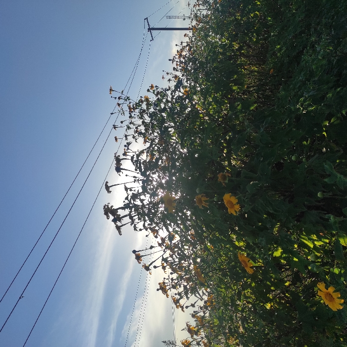The image displays an outdoor scene in Barakin Lerawi, Nigeria. A clear blue sky occupies the upper frame, featuring scattered cirrus clouds and a low sun positioned behind the central vegetation, creating a bright flare and backlighting the upper foliage. Three distinct parallel overhead power lines traverse the sky from left to right. A dark utility pole is visible on the far right, supporting these lines, with a second, more distant pole partially observable behind it. The lower two-thirds of the frame are dominated by a dense and tall growth of broad-leafed plants, prominently displaying numerous yellow, multi-petaled flowers in varying stages of bloom and senescence. The foliage exhibits varying shades of green, with brighter areas illuminated by direct sunlight and darker sections remaining in shadow. No individuals, animals, or vehicles are present in the scene.