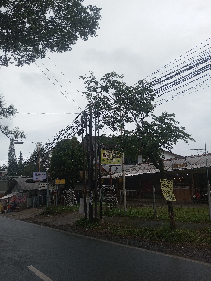 A street view under a cloudy sky showcases a neighborhood with power lines crisscrossing above. Buildings of various sizes and conditions line the street, interspersed with trees and vegetation. Signage is visible, and a few figures are present in the background. The pavement appears wet, reflecting the overcast conditions. Power poles stand near the roadside, adding to the urban landscape.