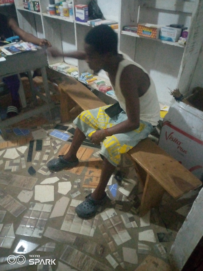 Inside a shop with shelves stocked with goods, a person wearing a white tank top and patterned shorts sits on a wooden bench. They have dark-colored clogs on their feet and a phone tucked into their shorts. The floor is covered in irregular mosaic tiles, some reflecting light. Another person stands at a counter on the left. A box with "Visita Plus" is seen in the background on the right. The room appears dimly lit. A "TECNO SPARK" watermark is visible in the bottom left corner of the image.