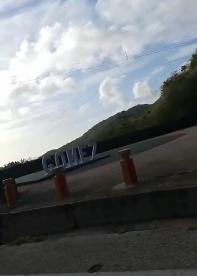 view from a vehicle moving along a road. The sky is visible, with a mix of clouds and clear patches. In the background, there are hills and trees. The roadside is lined with a low wall or barrier and vegetation. There are also some palm trees. As the video progresses, the sun becomes more visible, shining through the branches of the trees.