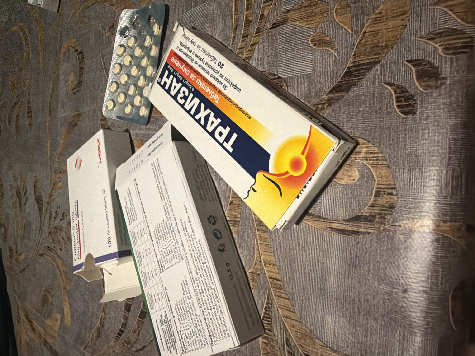 The image displays a flat lay of several pharmaceutical product packages and a blister pack on a patterned surface. The surface is dark grey with an interwoven, abstract pattern in muted brown and lighter grey tones, possibly depicting stylized leaves or organic shapes. The texture appears to be either fabric or a laminate material. Visible objects include: * **Top left:** A white cardboard box for "Concor 5 mg film-coated tablets" containing "bisoprolol fumarate." The box is partially open and torn on the top flap, revealing the inner packaging. "100 film-coated tablets" is printed on the front, along with the "MERCK" logo. * **Top right:** A silver foil blister pack containing numerous light yellow, round pills. Several cavities are empty, indicating partial consumption of the contents. At least 16 pills remain. * **Bottom left:** A second white cardboard box, partially obscured, shows text primarily in Bulgarian, including dosage instructions in tabular form and text describing content as "13,5 g". This box appears to be an accompanying information leaflet or another medication box. * **Bottom right:** A prominent white, blue, and orange cardboard box for "ТРАХИЗАН" (Trakhizan). The text on the box indicates it contains "0.5mg/1.0mg/1.0mg" "Таблетки за смучене" (Tablets for sucking/lozenge) for "За локално лечение на възпаления и инфекции на устната кухина и гърлото" (For local treatment of inflammations and infections of the oral cavity and throat). It specifies "20 Таблетки за смучене." This box is closed. The presence of Bulgarian language text on the "Trakhizan" box and the obscured box on the bottom left indicates the items are located within Bulgaria. There is no specific visual or textual information within the image to further pinpoint the exact city as Sofia. The lighting is consistent with an indoor environment. No individuals or active interactions are depicted.