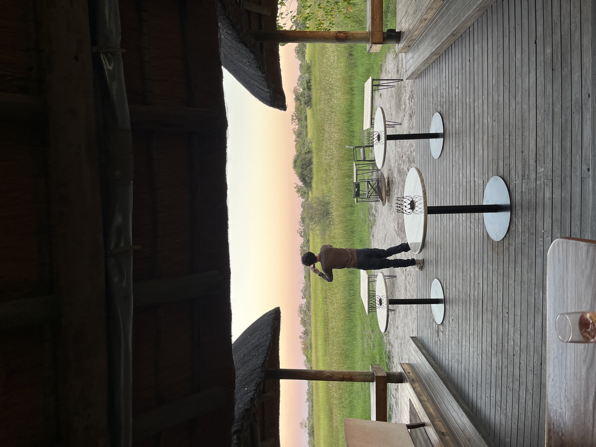 A man stands on a wooden deck in Khwai, Botswana, overlooking a grassy field under a pastel sky, possibly at sunset. The scene is partially obscured by a thatched-roof building on the left, with several round tables and chairs positioned on the deck, offering a view of the landscape. The man, wearing a brown shirt and dark pants, is facing away from the viewer, seemingly observing or photographing the scenery.