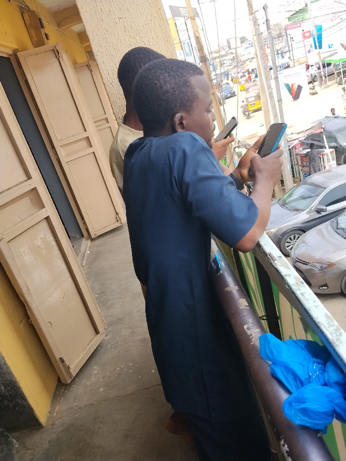 The scene is set in Fagge A, Nigeria, viewed from an elevated position such as a balcony. In the immediate foreground, two individuals are visible. The individual closer to the viewer and the balcony railing is an adult male with short dark hair, wearing a dark blue short-sleeved tunic. He holds a dark-colored smartphone with both hands, actively viewing its screen. Behind him and slightly to his left, a second adult male with short dark hair, wearing a light-colored shirt, is partially visible, also holding a dark smartphone and looking at its screen. To their left, a section of a building wall painted yellow-gold is visible, alongside two tan-colored, vertically paneled doors, appearing closed. To their right, a worn metal balcony railing with peeling paint in shades of green, blue, and brown extends across the frame. A crumpled blue plastic bag is draped over this railing. Beyond the railing, a busy urban street unfolds. Several parked cars, including a silver sedan and a dark grey sedan, are visible immediately below. Further down the street, multiple yellow-and-black auto-rickshaws (Keke Napep), additional cars, and pedestrians are present. Utility poles with a dense network of overhead wires line the street. Commercial buildings with various signs, one displaying multiple smartphone silhouettes and others with partially legible text like "DALE" and "HE," indicate a commercial district. The sky appears bright, consistent with daytime conditions.