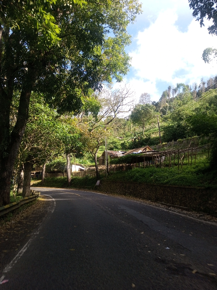This image depicts a two-lane asphalt road curving left through a verdant, mountainous landscape in the vicinity of Phonengam, Laos. The road surface is dark grey, with a faded white edge line visible on the left and remnants of a yellow center line. Scattered dry leaves are present on the asphalt. On the left side of the road, a low metal guardrail, possibly yellow or light green, runs along the shoulder. Beyond it, large, leafy trees with thick green foliage create a dense canopy, casting significant shadows across the road. To the right of the road, a low retaining wall constructed from irregular stones separates the asphalt from an upward-sloping terrain. Above this wall, a rustic residential or agricultural structure with a corrugated metal roof is partially visible, nestled amidst dense green vegetation. Adjacent to this structure, a prominent wooden trellis system, composed of vertical poles and horizontal crossbeams, supports green growth. Further up the slope, extensive green foliage covers the hillside, interspersed with taller trees, some appearing bare or sparsely leafed towards the crest. A utility pole stands on the right side of the road, extending into the hillside. The sky in the upper right quadrant is blue with scattered white clouds, indicating daylight. No individuals or animals are present. The scene is illuminated by natural light, with strong contrasts between sunlit and shadowed areas.