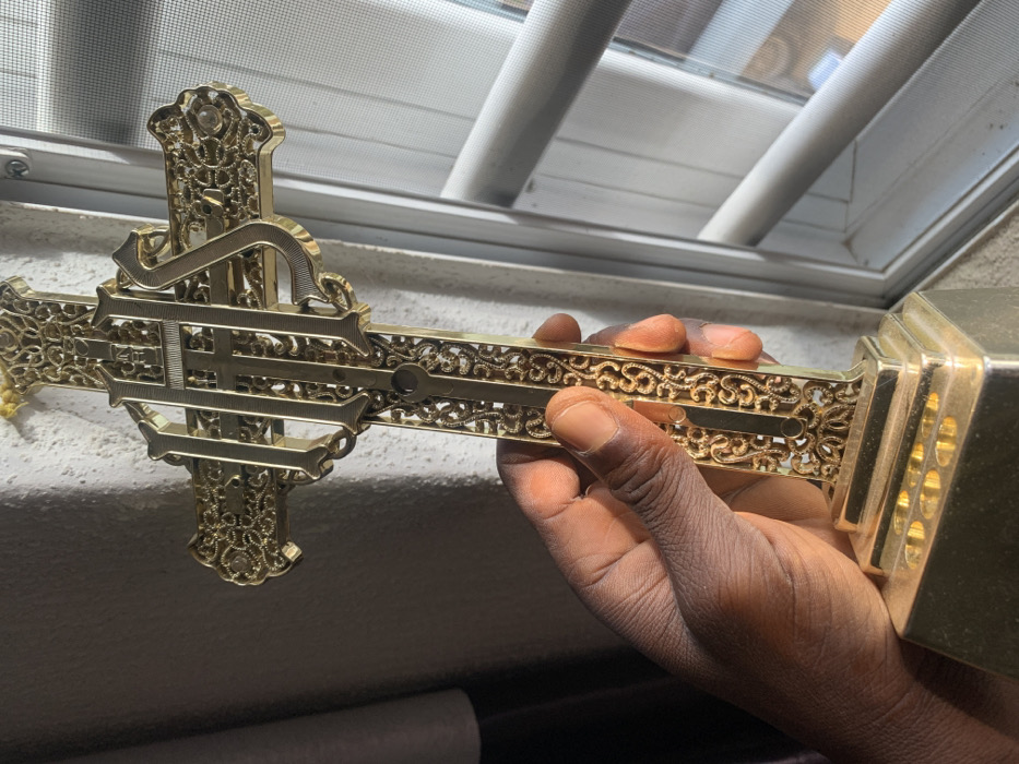 A dark-skinned right hand grasps the lower shaft and the trapezoidal base of a gold-colored, ornate decorative standing cross