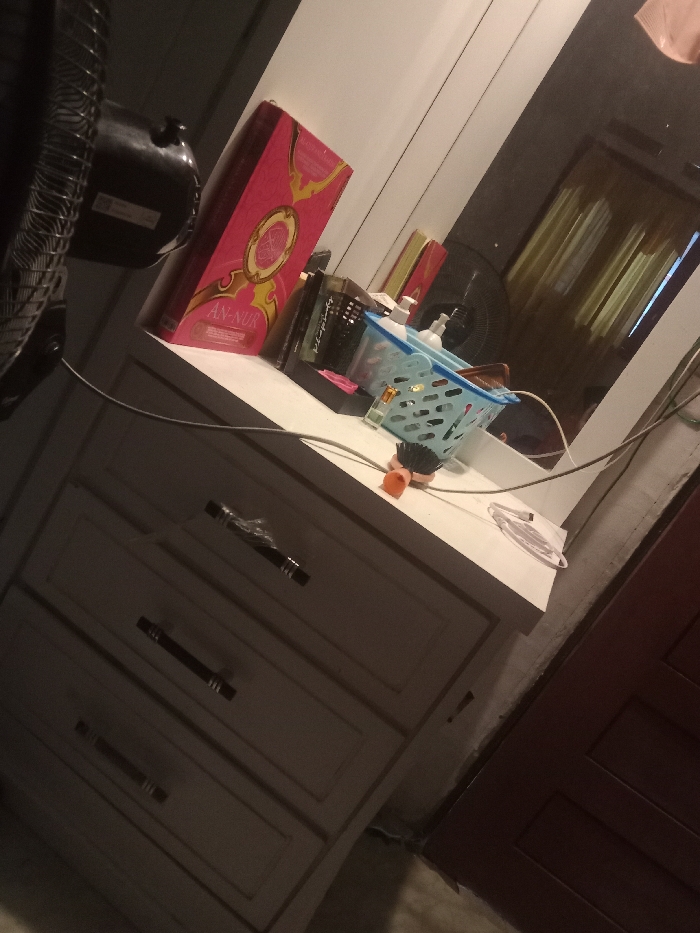 A dresser with three drawers sits near a red door. An assortment of items rests on top of the dresser, including a pink box labeled "AN-NUR," containers, a blue basket, and an orange-handled brush. A portion of a fan is visible in the image's left. A mirror behind the dresser reflects a room with curtains. A white power cord is also draped across the scene.