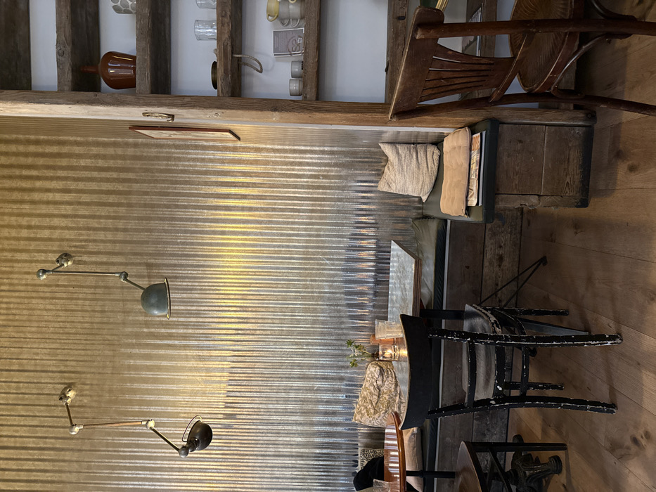 This image depicts the interior of a commercial establishment, likely a cafe or restaurant, located in Frederiksberg, Denmark. The main wall is constructed from corrugated metal, exhibiting a reflective silver-grey surface with warm golden highlights from interior lighting. Two industrial-style articulating wall lamps are mounted on this wall; the left lamp features a dark shade and an arm with a coppery tone, while the right lamp has a greenish-grey shade and a brass-toned arm. Along the corrugated wall, a dark green upholstered banquette runs, furnished with one patterned cushion and two plain off-white cushions. Two tables are positioned in front of the banquette. The table on the left has a dark wooden top, with a clear glass resting on it and a dark fabric item draped over the banquette behind it. The central table features a light grey, possibly metallic or distressed wooden top, supporting a small glass vase with green foliage, a lit candle in a clear holder, and two clear glasses. A dark wooden chair with significantly chipped black paint is positioned facing this central table. To the right, a dark wooden bench extension includes a beige cushion and several magazines. Adjacent to this, a rustic wooden shelving unit is built into a white wall. The top shelf holds a brown, pear-shaped bottle. The second shelf contains several clear glasses and a small metallic dish. The third shelf displays a white card and a loop of natural fiber rope. The bottom shelf presents a stack of yellow cups, two small grey cups, and another white card. A dark wooden bentwood chair is partially visible on the far right, in front of the shelving unit. The floor is composed of dark wooden planks. No individuals are present in the scene.
