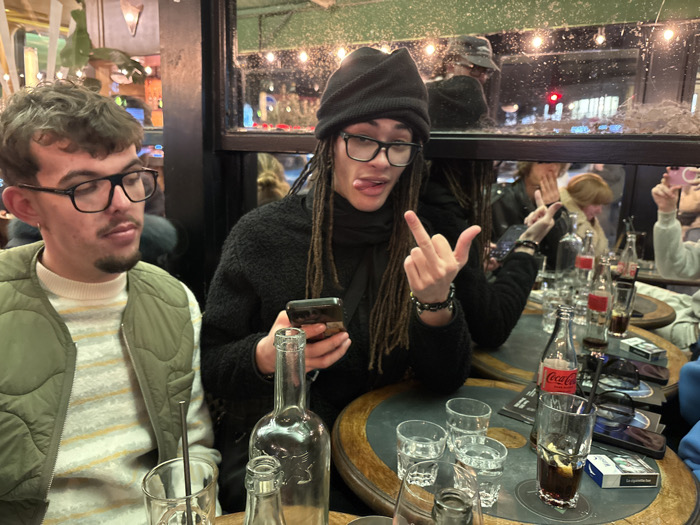 At a café, two young adults are seated at a round table littered with glasses, bottles, and cigarettes. The person on the right, wearing a black beanie and dreadlocks, holds a phone while sticking out their tongue and making a hand gesture. The individual to their left wears glasses and a vest, looking to the side. Other patrons are visible in the background, some holding phones. A window offers a glimpse of a nighttime city scene with lights.