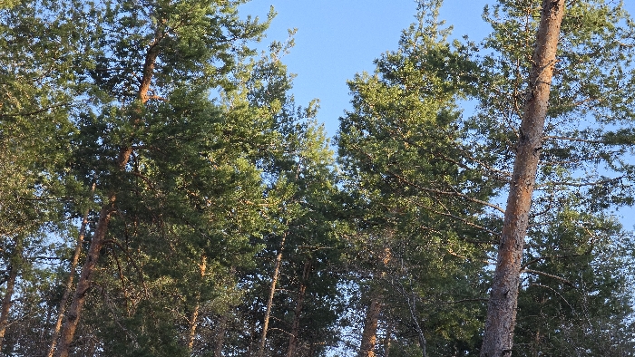 - "The scene depicts an upward view into a dense conifer forest canopy under a clear sky, located in Stoletovo, Bulgaria" by FM-UgNOv2, licensed under CC BY 4.0
