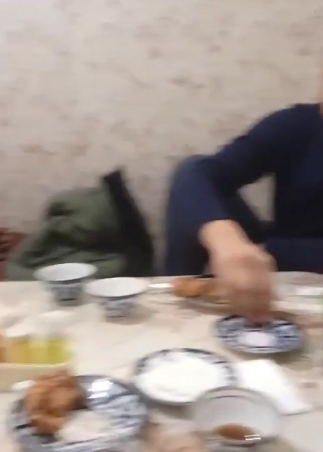 two men sitting at a table eating. The table is covered with a patterned tablecloth and set with plates, bowls, and drinks. The first man, wearing a dark blue sweater and a green cap, is shown eating from a skewer of grilled meat. There is a bottle of Coca-Cola on the table in front of him. The camera pans to the second man, who is wearing a black shirt. He is holding a cigarette and is also eating. A teapot, plates of food, and a phone are on the table near him. The walls of the room have a light-colored, textured pattern. A green jacket is visible on the back of a chair behind the table.