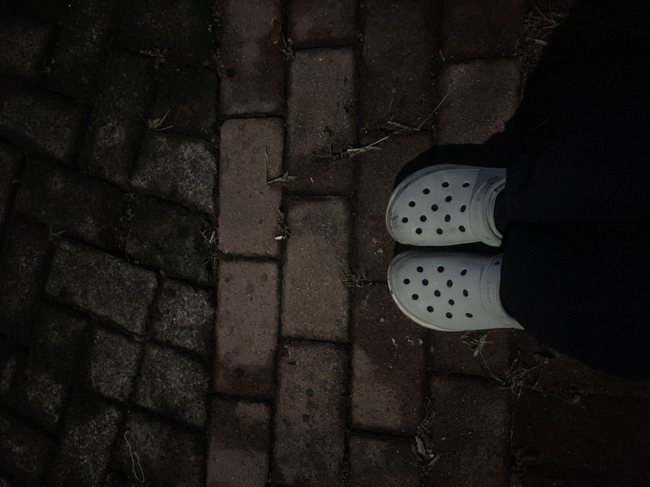 This overhead image depicts an individual standing on a paved surface in Batulawang, Indonesia, under low-light conditions. The person is wearing dark-colored pants and light grey Crocs footwear, with the prominent vent holes and "CROCS" branding visible on the shoes. The ground immediately beneath and in front of the individual consists of a reddish-brown brick pavement, arranged in a stretcher bond pattern, interspersed with small amounts of green vegetation and dry debris. Further into the distance, the pavement transitions to a darker, rougher surface composed of irregularly shaped grey concrete or stone pavers. The ambient lighting is dim, indicating either nighttime or heavy shadowing, with an unseen light source casting a faint illumination on the ground and creating subtle shadows from the individual's legs. No other individuals or significant objects are visible.