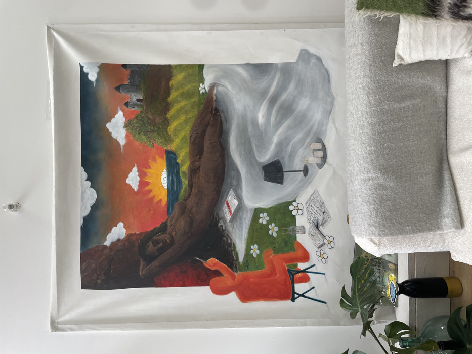 A large painting, approximately 2.5 meters in height, is displayed on a white wall in Saint-Denis, France. The artwork is affixed at its upper corners, showing slight creasing along its white border. The painting depicts a surreal outdoor landscape at sunset or sunrise. The sky graduates from deep red to orange, featuring stylized white clouds and a bright yellow sun partially submerged in a body of dark blue water. On the right, green rolling hills are visible, topped by a single green tree and a grey stone castle with multiple towers. The foreground is a vibrant green field scattered with white daisies. A large, dark-skinned nude female figure lies reclined on the left, leaning against a dark reddish-brown tree trunk or rock formation. Her eyes are closed, and her left arm is bent behind her head. A red and white object, resembling a book or cigarette pack, rests near her waist. A flowing, light grey drapery or sheet extends from her lower body across the ground to the right. To the lower left, a stylized, monochromatic orange humanoid figure sits on a small blue stool. This figure holds a white brush or pen, gesturing towards the nude figure. On the ground near the orange figure are several white daisies, a clear glass jar containing paintbrushes, and sheets of paper covered with writing or notation. On the grey drapery, a small black table lamp and a round grey tray holding three white candles are arranged. In the physical foreground of the room, a light-colored sofa partially covered by a light grey textured blanket is visible. To the left of the sofa, a clear glass vase with green plant foliage (likely Monstera) and a black and gold decorative vase are situated on a white surface.