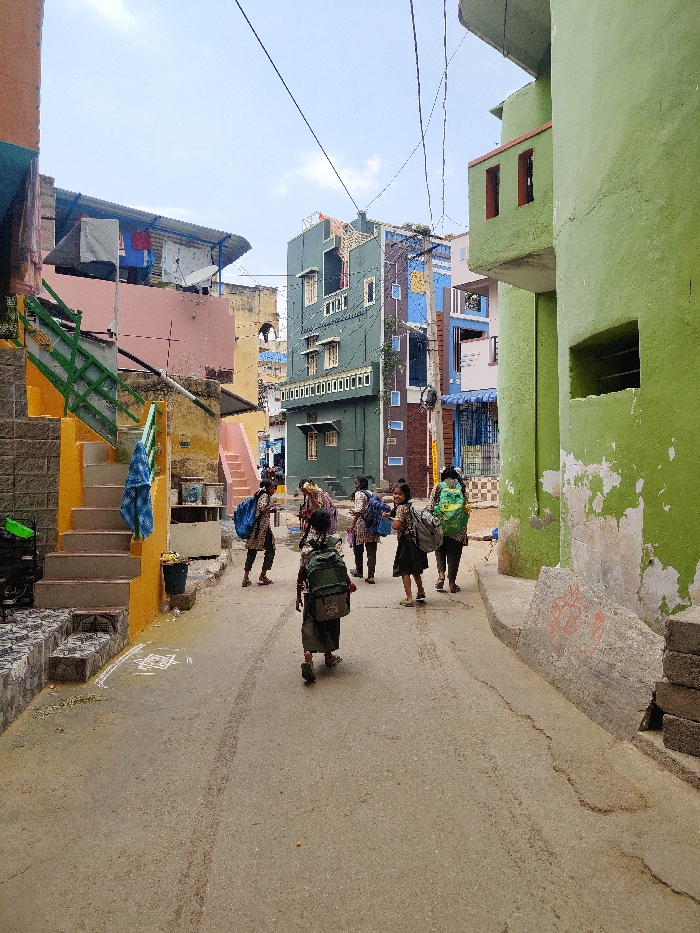 The image displays a narrow, paved residential street in Pedda Kammavaripalli, India, under a clear, bright sky. A group of approximately six to seven children, predominantly female and appearing to be schoolchildren, are depicted walking along the street. Most children carry backpacks, some of which are blue, green, or grey, and several wear what appear to be school uniforms consisting of checked shirts and dark skirts or dresses. One child in the immediate foreground walks away from the camera, carrying a large green backpack. Another child in the mid-ground looks towards the camera. Buildings line both sides of the street. On the left, a structure with a yellow concrete staircase and green metal railings leads upwards to a pink-colored wall section, topped by a rudimentary roof structure where clothes are hanging to dry. Below the stairs, a blue bucket is visible, and a white geometric pattern (kolam) is drawn on the pavement. A green motorbike is partially visible at the far left base. In the center-left background, a multi-story building painted dark teal features multiple windows and decorative elements. To its right, various buildings exhibit blue, pink, and white paint, some with metal grilles. On the right side of the foreground, a light green building wall, exhibiting peeling paint and wear, has a rectangular open niche. Utility wires are prominently strung across the sky overhead. Tire tracks are visible on the street's surface.