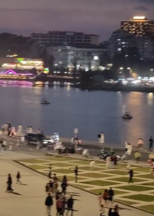 nighttime view of a city waterfront area bustling with people. In the foreground, a paved plaza is visible, featuring a geometric pattern of light-colored tiles and grass patches. People are walking, standing, and interacting on the plaza. Adjacent to the plaza is a road with pedestrian traffic and some motorbikes. Beyond the road is a body of water, possibly a river or a lake, reflecting city lights. Several small boats are on the water. The background features a skyline of buildings, illuminated with lights. The sky is dark, with hints of twilight. There are some trees scattered around the area. The overall atmosphere appears lively and urban, with people enjoying an evening stroll or gathering by the waterfront.