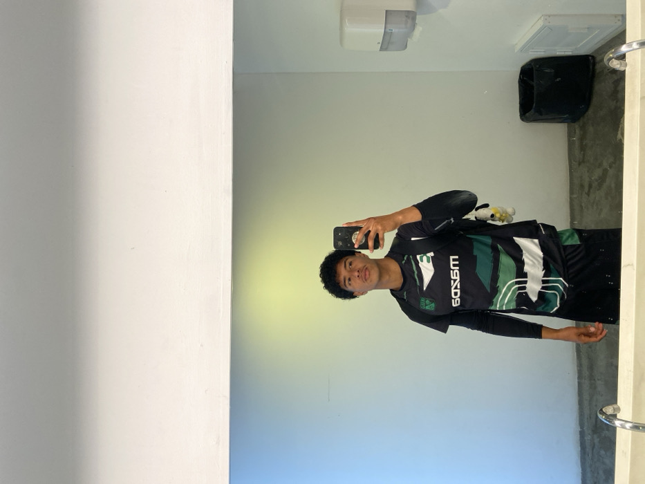 A young man stands in a bathroom, taking a mirror selfie. He wears a black long-sleeved shirt with a green and white design, along with black shorts. The bathroom is brightly lit with a white wall to the left. A hand soap dispenser and a covered bin are visible in the background. The wall behind him has a gradient of yellow to blue. He is holding a phone up to take the picture.