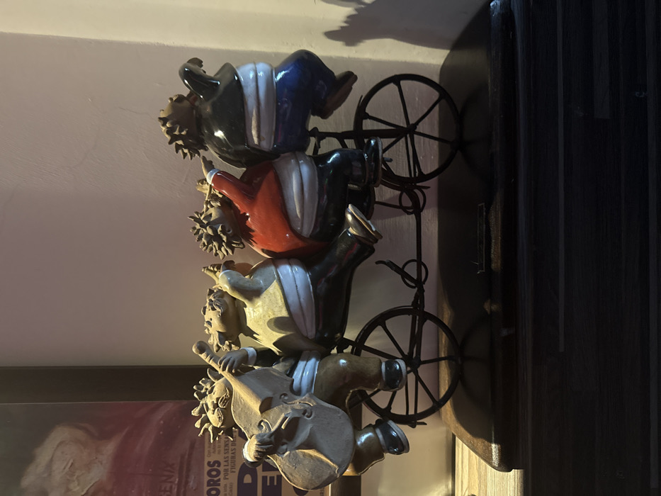 A whimsical stacked sculpture depicts four figures in various colorful attire, seemingly seated on a bicycle frame with two wheels. The bottom figure plays a stringed instrument. The figures above are dressed in red, blue, and light brown/cream clothing. The sculpture is mounted on a wall with a darker element adjacent to it. The overall tone is lighthearted and unique.