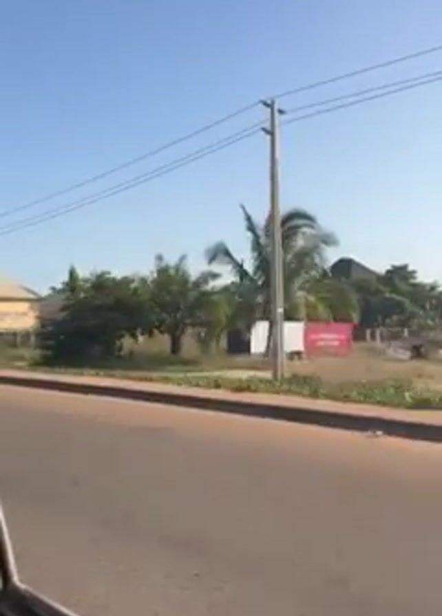 The video depicts a view from a car moving along a paved road. The sky is clear and blue. Along the side of the road, there are various buildings and trees. One building appears to be under construction. A motorcycle with two people is briefly visible on the road. Power lines run parallel to the road.