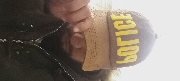 A person wearing a dark jacket with a visible zipper and a baseball cap with "POLICE" embroidered in yellow. The hat is positioned on their head, obscuring part of their face, and their hand is visible near their face. The background appears to be a bright, possibly outdoor setting.