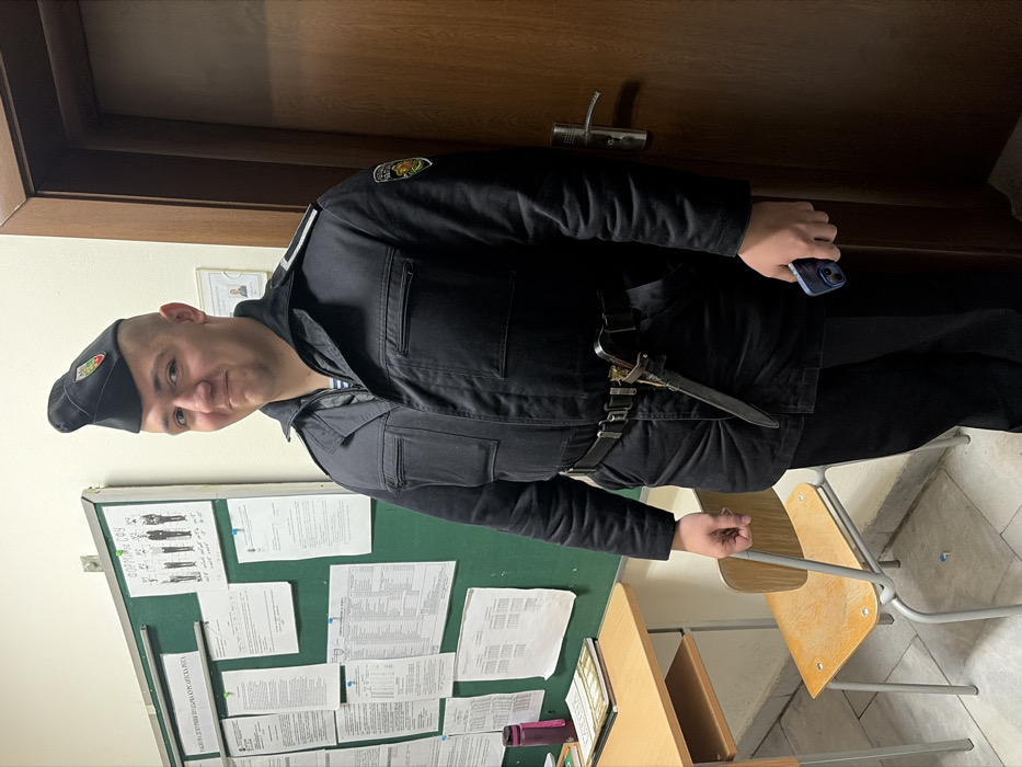 A male individual, an adult, stands centrally in an indoor setting, identified as a facility of the Nikola Vaptsarov Naval Academy in Varna, Bulgaria, based on Bulgarian text on a visible bulletin board stating "ФОРМА НА СВУ" (Uniform of Naval Academy) and "ТАБЛО НА ДЕЖУРНИЯ ПО КУРСОВЕТЕ И РОТА" (Board of the Duty for Courses and Company)