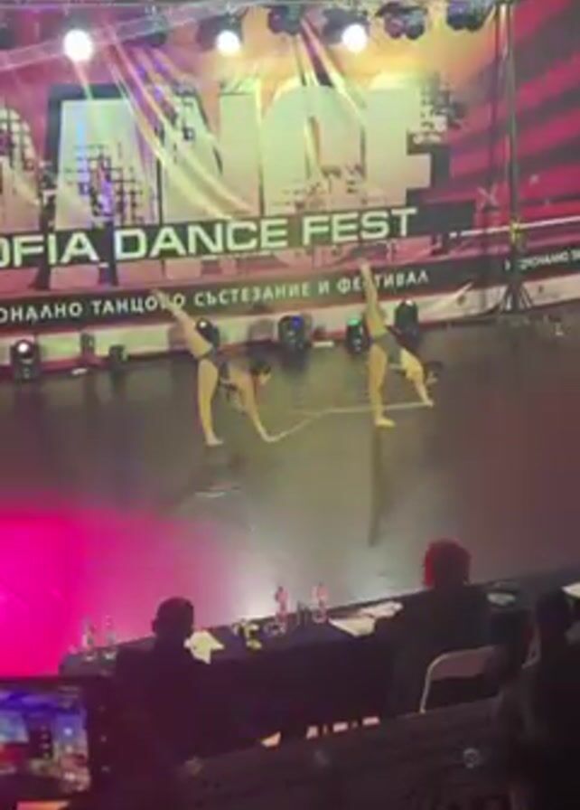 Two dancers perform on a stage in front of a panel of judges, at the Sofia Dance Fest