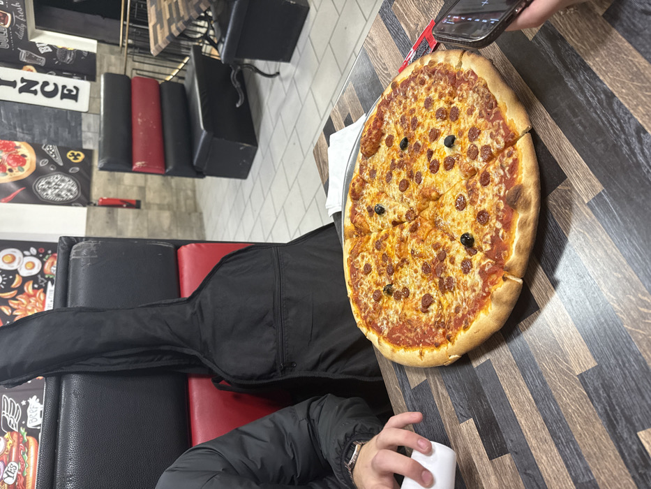 A pepperoni pizza with black olives is served on a patterned table. The pizza is cut into slices. A cell phone is in the upper right corner of the image, held by a hand. Another hand is visible on the bottom right of the image, holding a white cup. A guitar case and seating are visible to the left of the pizza. The seating is black and red. The floor is tiled.