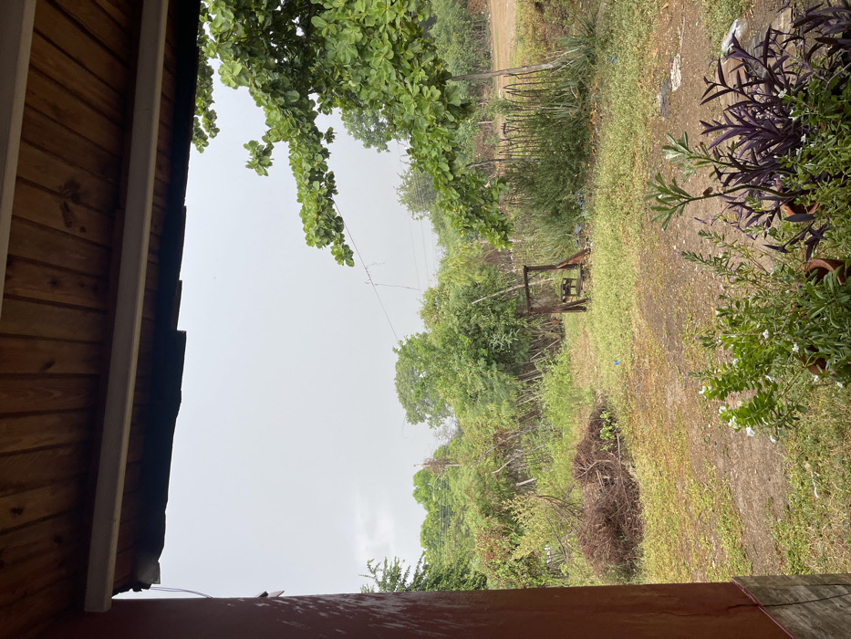 The image captures an outdoor scene from beneath a wooden ceiling structure, likely a porch or overhang, in Altagracia, Venezuela. The sky is overcast and light grey, suggesting a cloudy or rainy day, with moisture visible on a reddish-brown structural column on the left. In the immediate foreground, a potted plant with green foliage and small white flowers, alongside a second pot containing plants with deep purple leaves, are positioned at the bottom right. The midground consists of an unkempt grassy and dirt area. A substantial pile of dry, dark brown branches and brush is located on the left side of this area. Towards the right, a rustic, unfinished, or partially dismantled wooden swing frame is present. The background features dense, varied green foliage and numerous trees extending to the horizon. Faint, dark lines, possibly wires or power lines, are discernible traversing the middle distance against the treeline. A dirt path or track runs along the far right edge of the frame. No individuals are present.