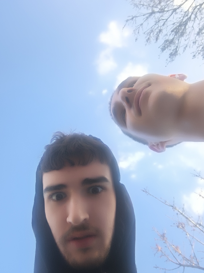 - "The image displays two male individuals captured from a low-angle perspective against an outdoor backdrop of a bright blue sky with diffused white clouds and bare tree branches" by FM-RsvT33, licensed under CC BY 4.0