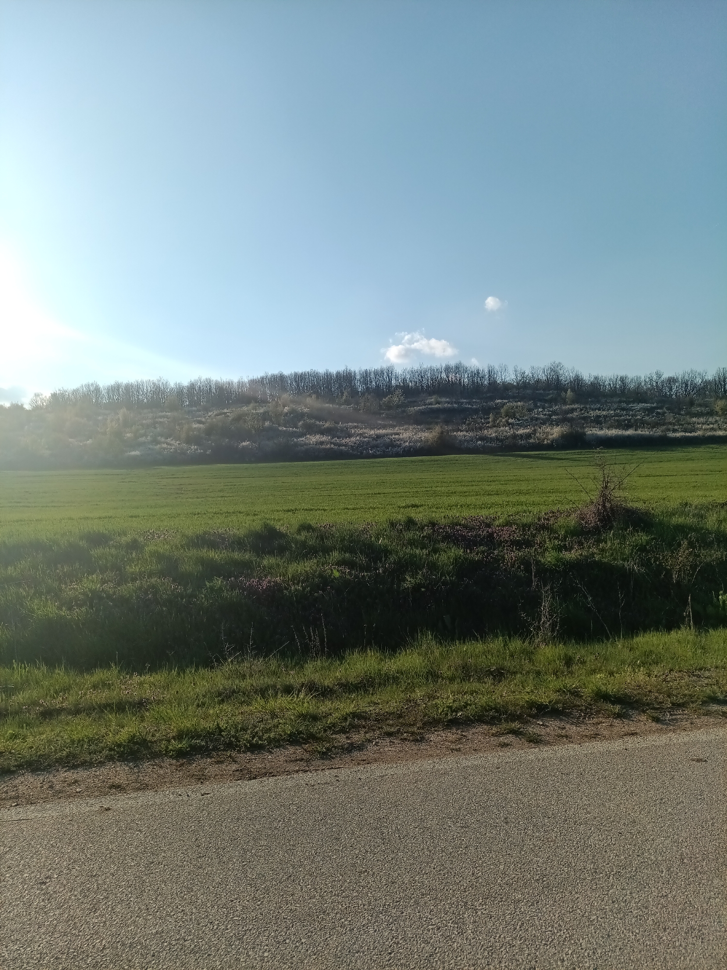 The scene depicts a field of green grass in Protopopintsi, Bulgaria, situated on a hillside with a row of leafless trees lining the horizon. In the foreground, there is a strip of shorter grass and a paved road. The sky is a clear blue, with the sun visible on the left, creating a lens flare effect. Two small clouds are visible on the horizon.