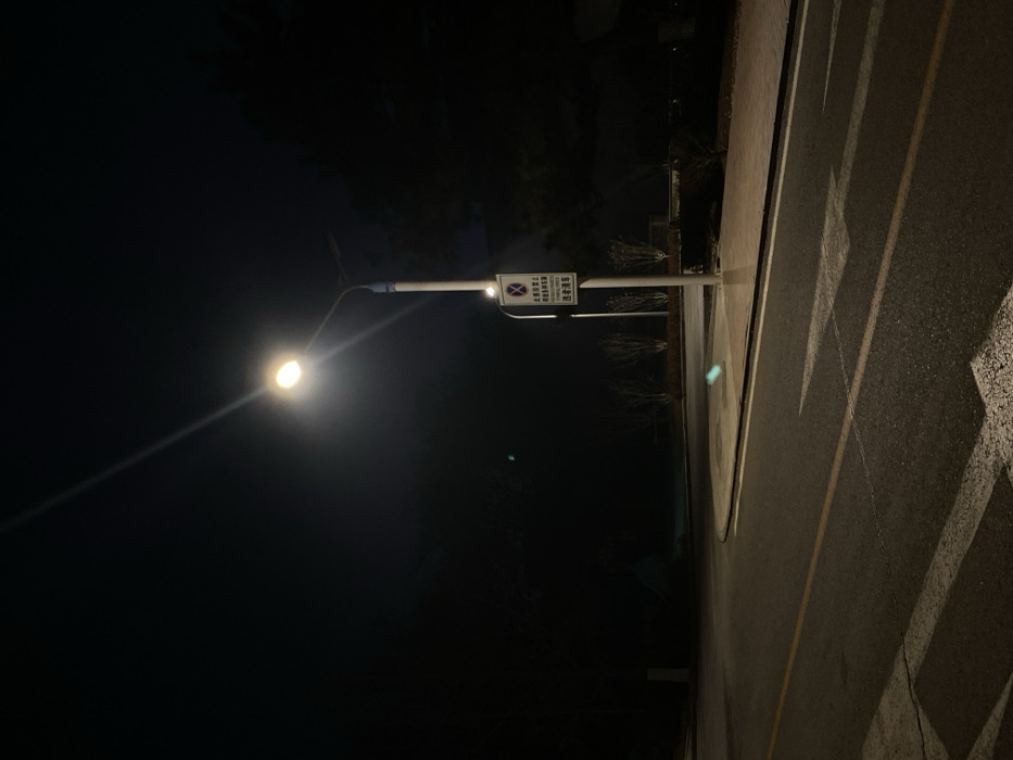 The image depicts a deserted street scene at night in the city of Zhongtun, China. A single, active streetlamp with a bright, warm-toned light source stands prominently on the right side of the frame, illuminating a portion of the asphalt road and an adjacent paved sidewalk. The streetlight pole is light-colored and has a rectangular white sign attached, displaying Chinese characters and a red circular 'no parking' symbol. The road features white pedestrian crossing lines, a white left-turn arrow marking, and a yellow dividing line. To the left, the road curves slightly. The background and areas beyond the streetlamp's immediate illumination are dark, revealing the silhouettes of trees or shrubs along the roadside and in the distance. The sky is dark, indicating nighttime. No individuals, vehicles, or discernible activities are present in the visible area.