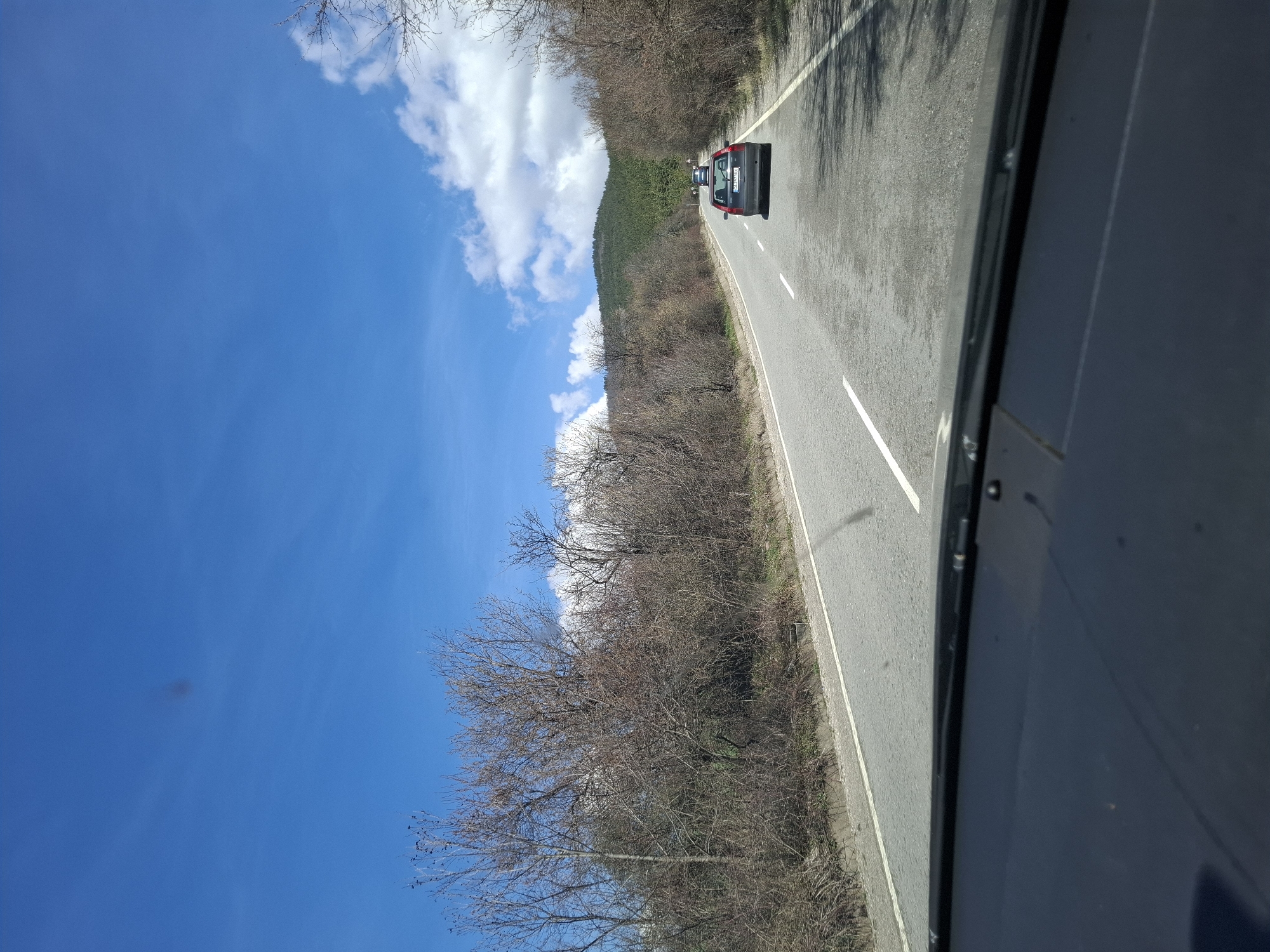 The image depicts a view from inside a vehicle traveling on a two-lane road in Manastirishte, Bulgaria. A car is visible ahead, moving in the same direction. The sky is blue with scattered clouds. The road is flanked by trees and some vegetation. The image is oriented vertically, potentially due to being taken from a mobile device.