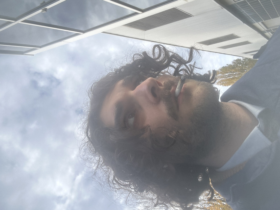 A low-angle, eye-level image captures a male subject in Chatou, France, facing right and looking upward. The individual has dark, curly, shoulder-length hair and facial hair consisting of a mustache and a short beard. He wears a light blue collared shirt, a dark tie, and a dark blue jacket. A lit, hand-rolled cigarette with a visible ash tip is held between his lips. The background on the right features a modern building with light-colored exterior walls and dark-framed windows reflecting the overcast sky. Blurred trees with autumnal foliage are visible on the left side of the frame. The scene is illuminated by diffused natural light under a cloudy sky.