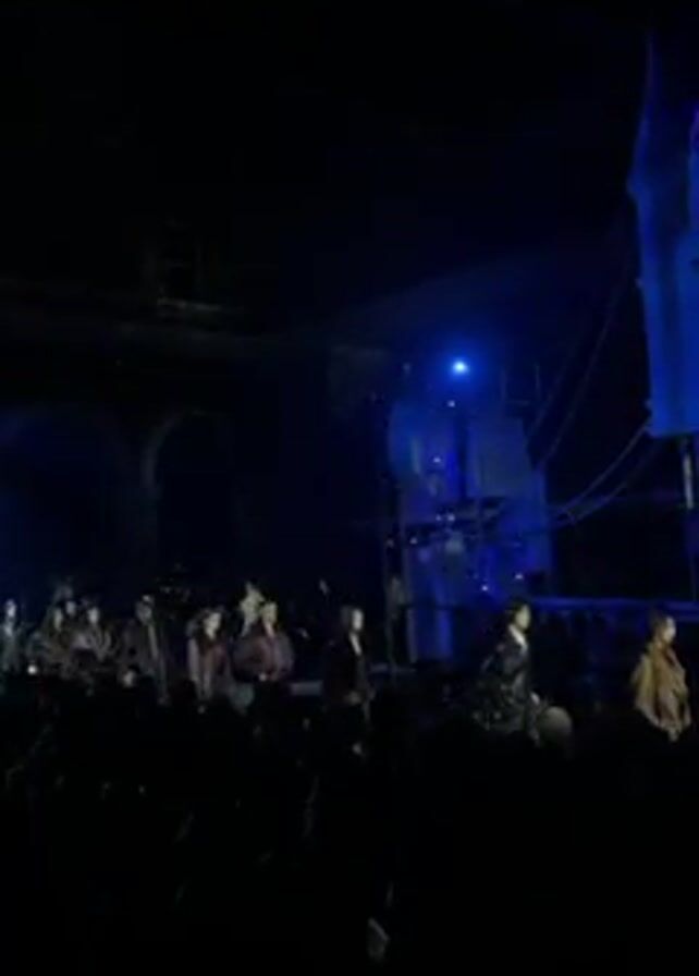 fashion show in a dark room with blue lighting. People are walking on a runway, displaying clothing, in front of a seated audience. The stage has architectural set pieces resembling a castle. There are metal structures and lighting rigs above the stage. The video is filmed from the audience perspective.