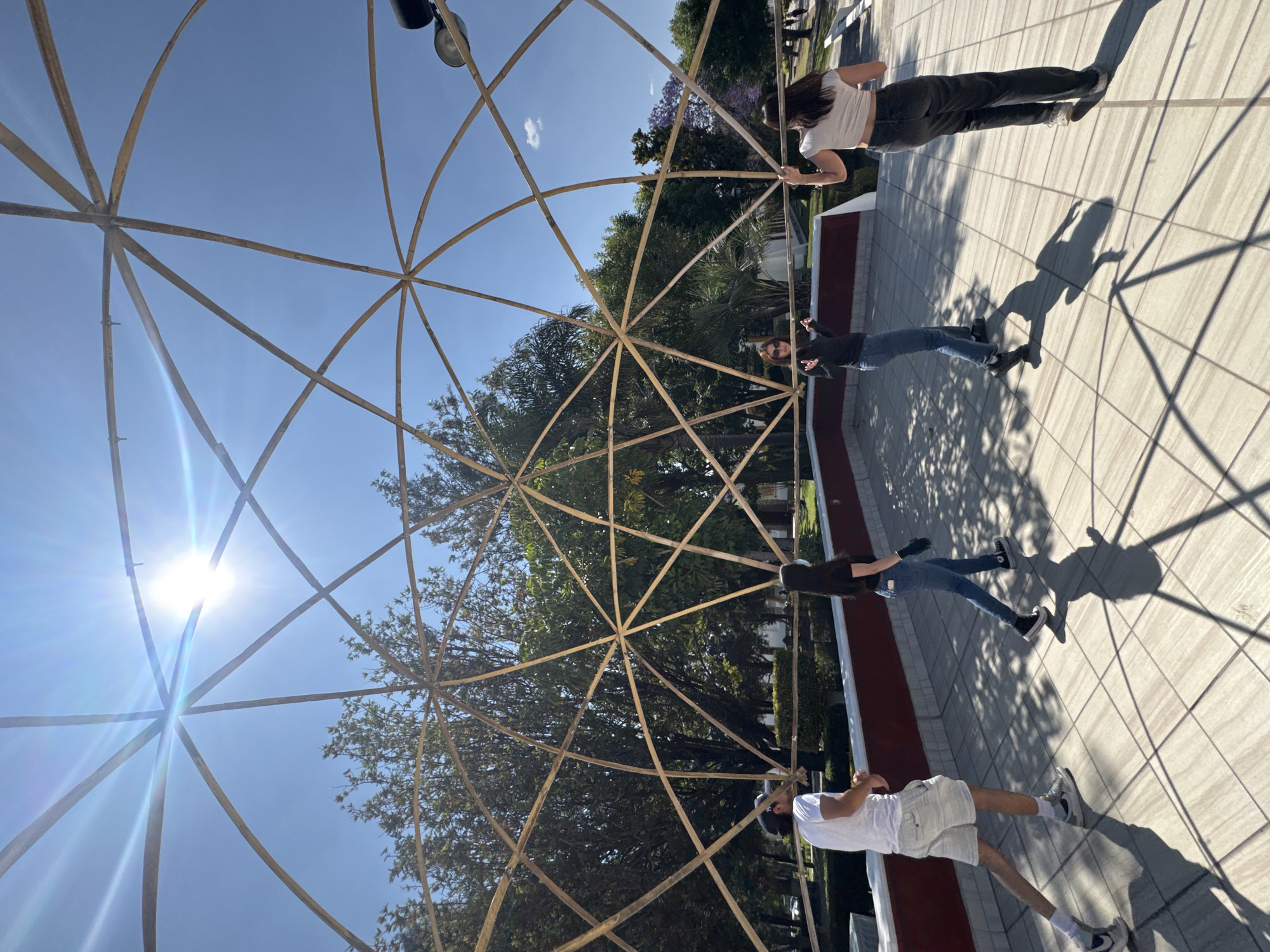 The image depicts an outdoor scene in a public space within San Andrés Cholula, Mexico, under bright sunlight. In the foreground, a large, open geodesic dome-like structure, constructed from light-colored poles, occupies the majority of the frame, its intricate network casting strong shadows on the tiled ground. Four individuals are present near or within this structure. From left to right: 1. A male, wearing a white t-shirt, light shorts, athletic shoes, and a backward dark baseball cap, walks from left to right, looking toward the right. He is partially leaning against a low wall with a red top and white base. 2. A female, with dark hair, wearing a black t-shirt, blue jeans, and black sneakers, walks from left to right. A light-colored face mask is pulled down below her chin, and she wears a dark glove on her left hand. 3. A female, with dark hair and sunglasses perched on her head, wears a dark long-sleeved top and blue jeans. She stands with her arms slightly raised and hands open, looking toward the right. 4. A female, with dark hair, wears a white cropped t-shirt and dark jeans. Her back is mostly to the viewer, and she holds onto one of the dome's poles with her right hand. The ground is covered with light-colored square tiles. Beyond the red-topped wall, a lower grassy area with manicured hedges and numerous tall trees, including some with green foliage and one with distinctive purple blossoms (Jacaranda) in the far right background, is visible. The sky is clear and blue, with a bright sun high in the upper left, causing a distinct lens flare. A small white cloud is visible in the upper right. A black outdoor light fixture is attached to the dome structure in the upper right quadrant.