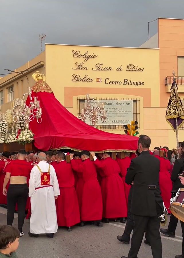 A religious procession moves down a paved street, passing by a two-story building labeled “Colegio San Juan de Dios Goleta Centro Bilingue.” The procession is led by men wearing red robes who carry a large platform draped with red fabric and adorned with silver candelabras. A priest in a white robe walks alongside them. Several men in black suits follow, some playing drums. People are watching the procession from the side of the street. The sky is overcast. A young child is seen in the foreground.